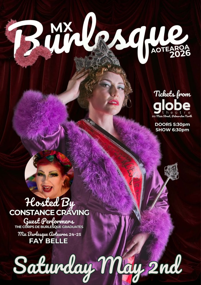 Special step down performance from the current Mx Burlesque Aotearoa 2024/25 Palmerston Norths own Burlesque Superstar Fay Belle. Guest Performance by The Corps de Burlesque Graduates and hosted by award winning MC Constance Craving.